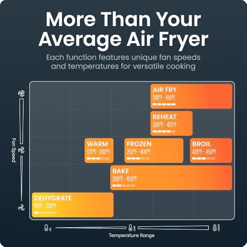 - SEVEN COOKING FUNCTIONS: You can air fry, bake, broil, dehydrate, reheat, keep your food warm, or cook your favorite meals from frozen, all in one multifunctional countertop air fryer! Craft almost any meal with ease and feed the family faster than ever.